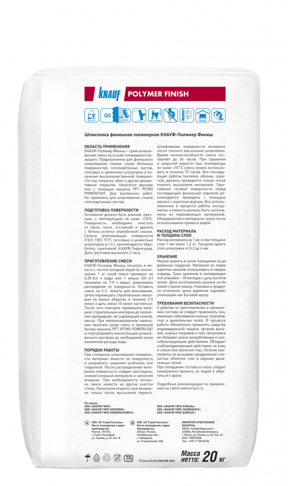 Применяется внутри помещений для финишного шпаклевания тонким слоем бетонных поверхностей, гипсокартонных и гипсоволокнистых листов, гипсовых и цементных штукатурок и получения поверхности под покраску, обои и другие декоративные покрытия.