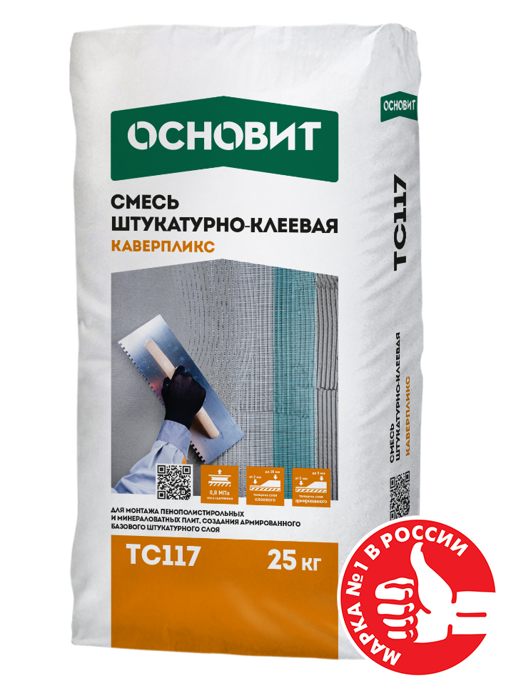 Штукатурно-клеевая смесь ОСНОВИТ КАВЕРПЛИКС ТС117 предназначена для монтажа пенополистирольных и минераловатных плит, создания армированного базового штукатурного слоя. Рекомендуется для создания “дышащих” систем утепления фасадов как новых, так и старых зданий. Применяется при устройстве системы фасадной теплоизоляции ОСНОВИТ. Для внутренних и наружных работ.